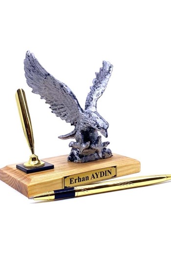 Kişiye Özel Tasarım Ahşap Kaideli Gümüş Kartal ve İmza Kalemi