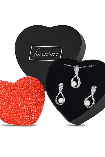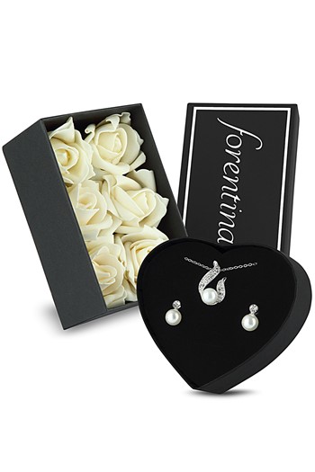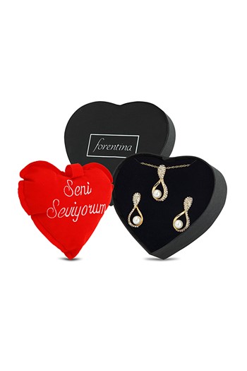 Forentina Güllü Kutuda Beyaz İnci Modeli Kolye Küpe Set PS1639