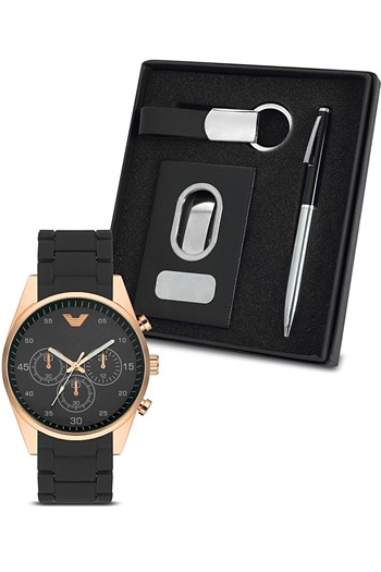 Forentina Siyah Erkek Kol Saati Kartvizit Kalem Anahtarlık Set PS1668