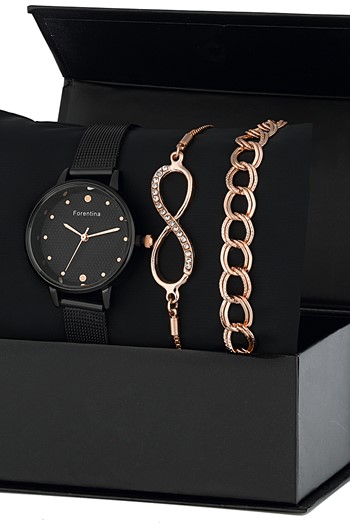 Forentina Siyah Hasır Bayan Kol Saati Bileklik Kombin PS1860