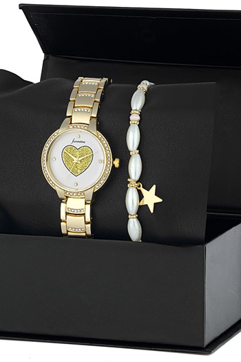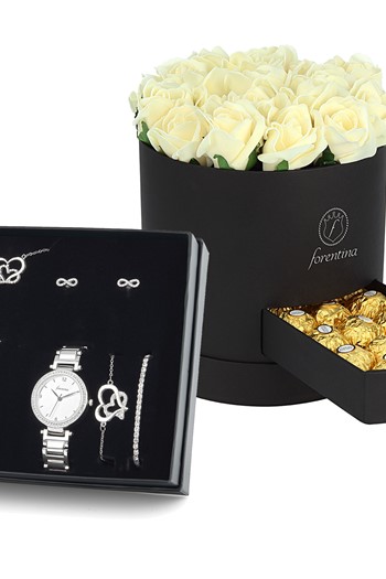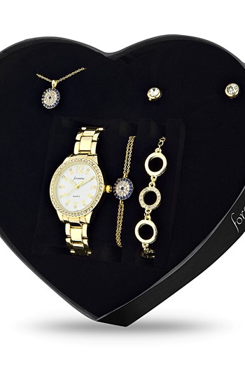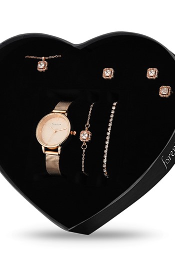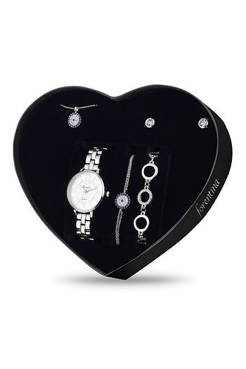 Forentina Çift Kalp Kolye Küpe Bileklik Saat Güllü Kutu Çikolata Hediye Set PS1907