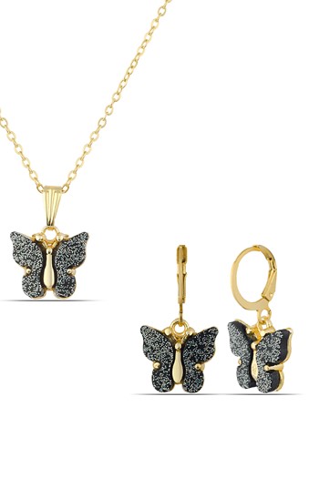 Forentina Siyah Kelebek Kolye Küpe Takı Seti PS1871