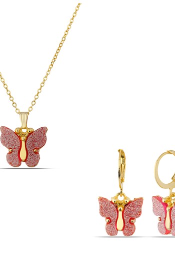 Forentina Pembe Simli Kelebek Kolye Küpe Takı Seti PS1872