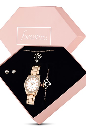 Forentina Rose Elmas Modeli Kolye Küpe Bileklik Saat - Hediye Set PS1895