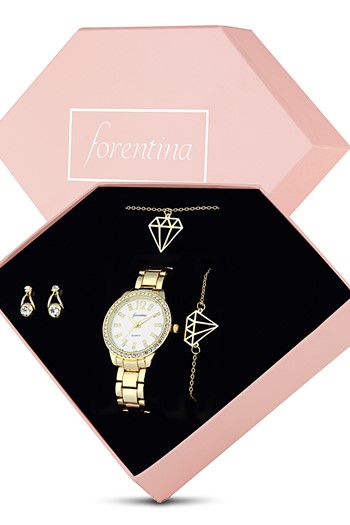 Forentina Elmas Modeli Kolye Küpe Bileklik Saat - Hediye Set PS1896