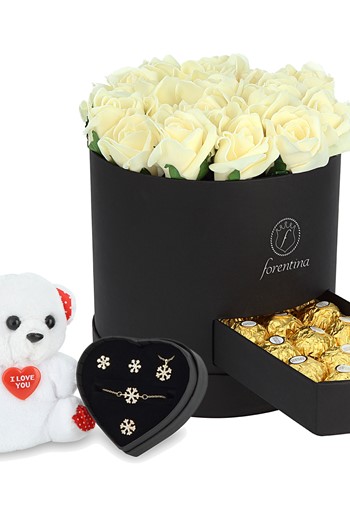 Forentina Kar Tanesi Kolye Küpe Bileklik Ayıcık- Güllü Kutu Çikolata Hediye Set PS1906
