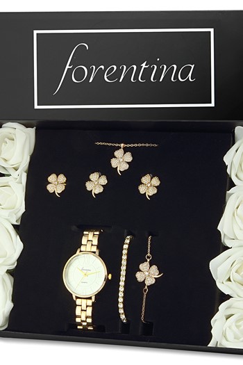 Forentina Yonca Kolye Küpe Bileklik Yüzük Saat Hediye Set PS2163