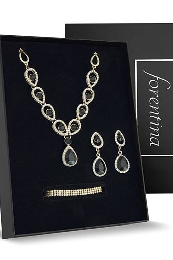 Forentina Siyah Taşlı Kolye Küpe Bileklik Düğün Seti PS2186