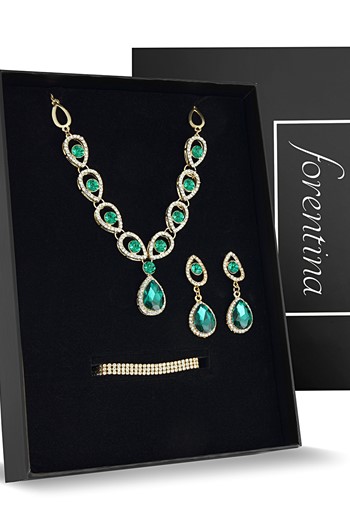 Forentina Yeşil Taşlı Su Yolu Kolye Küpe Bileklik Düğün Seti PS2187