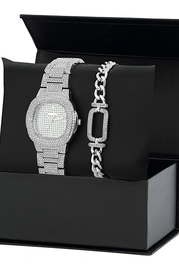 Forentina Gri Zirkon Taşlı Kol Saati Bileklik Kombin Set PS2202
