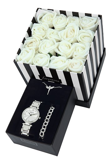 Forentina Beyaz Güllü Kutuda Gümüş Kaplama Melek Kolye Bileklik Saat Set PS2207