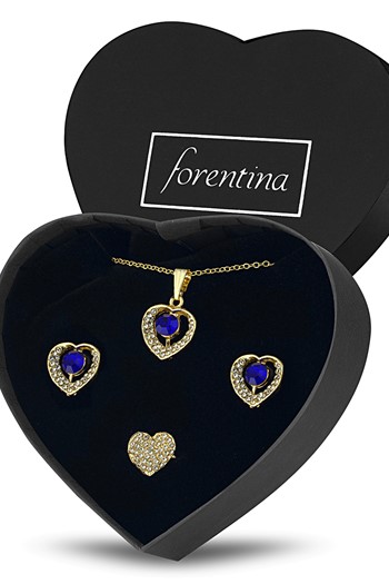Forentina Altın Kaplama Lacivert Taşlı Kalpli Kolye Küpe Yüzük Takı Seti PS2214