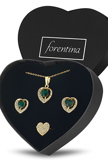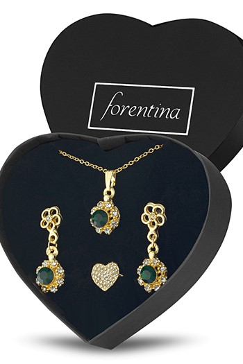 Forentina Altın Kaplama Yeşil Taşlı Tektaş Kolye Küpe Yüzük Takı Seti PS2221