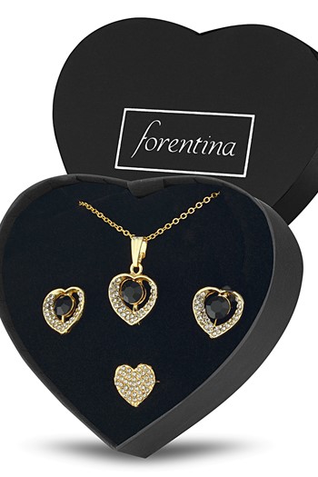 Forentina Altın Kaplama Siyah Taşlı Kolye Küpe Yüzük Set - Kalpli Kutuda Set PS2213