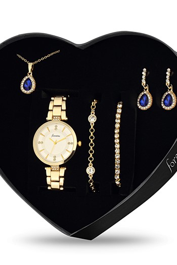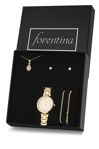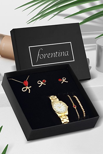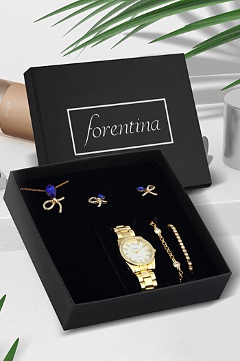 Forentina Altın Kaplama Zirkon Taşlı Kolye Küpe Bileklik Saat Hediye Set PS2420