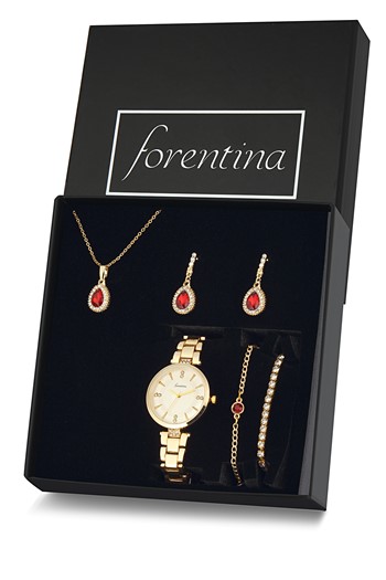 Forentina Kırmızı Taşlı Takı Seti - Saat Hediye Seti PS2361