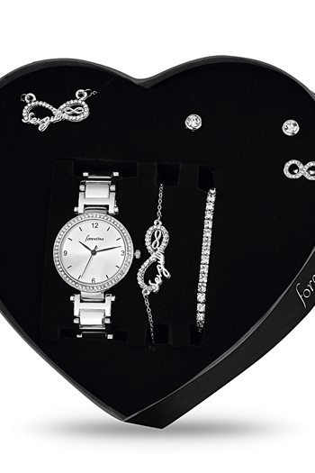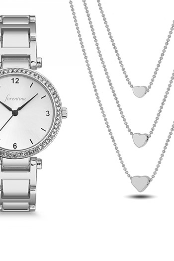 Forentina Gümüş Kaplama Bayan Metal Kol Saati Kalpli Kolye Kombin Set PS2372