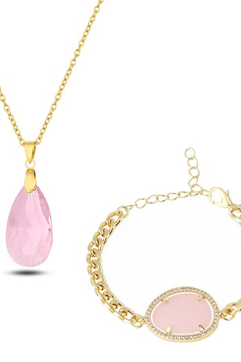 Forentina Altın Kaplama Pembe Taşlı Kolye Bileklik Kombin Set PS2375