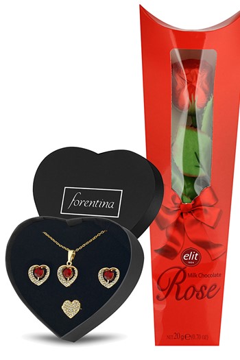 Forentina Kalp Kolye Küpe Bileklik Takı Seti - Gül Şeklinde Çikolata Hediye Set PS2379