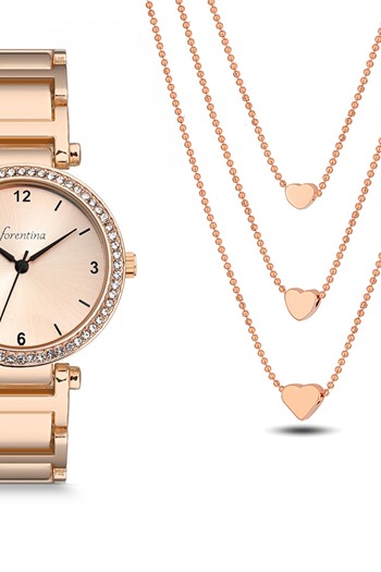 Forentina Rose Bayan Metal Kol Saati Kalpli Kolye Kombin Set PS2382