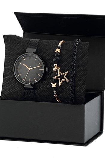 Forentina Bayan Siyah Hasır Kol Saati Bileklik Kombin Set PS2446