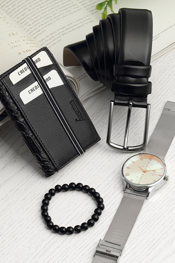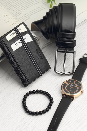 Forentina Erkek Siyah Kemer Cüzdan Bileklik Saat Hediye Set PS2437