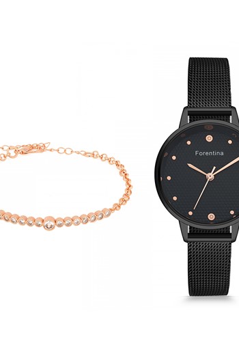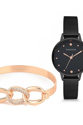Forentina Bayan Siyah Hasır Kol Saati Bileklik Kombin Set PS2445