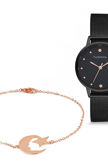 Forentina Siyah Hasır Bayan Kol Saati Şans Bilekliği Kombin Set PS2425