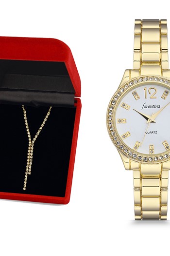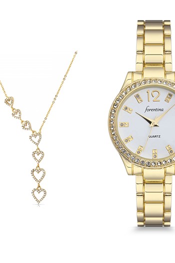 Forentina Bayan Sarı Metal Kol Saati Su Yolu Kolye Kombin Set PS2447