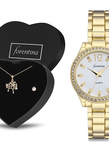 Forentina Bayan Sarı Metal Kol Saati - Hayat Ağacı Kolye Küpe Kombin Set PS2449