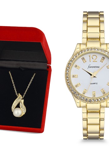 Forentina Bayan Sarı Metal Kol Saati İnci Kolye Kombin Set PS2450