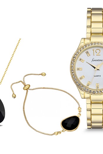 Forentina Bayan Sarı Metal Kol Saati - Siyah Taşlı Kolye Bileklik Kombin Set PS2451