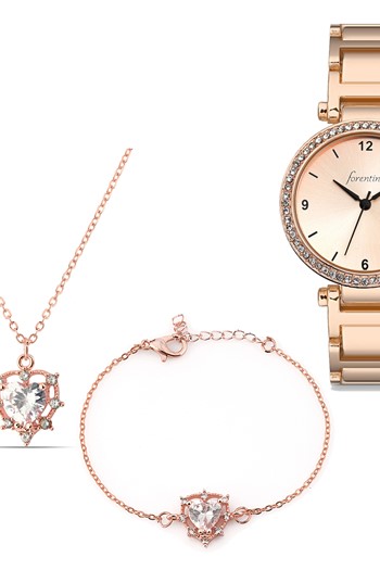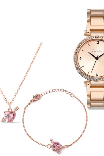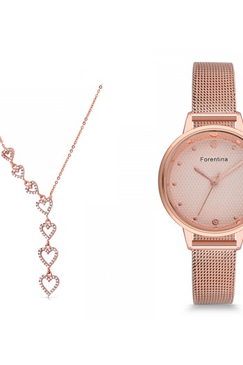 Forentina Bayan Rose Metal Kol Saati - Kalpli Kolye Bileklik Kombin Set PS2456