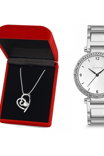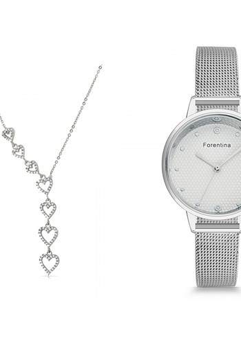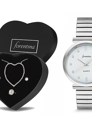Forentina Bayan Beyaz Metal Kol Saati Kalpli Kolye Kombin Set PS2463