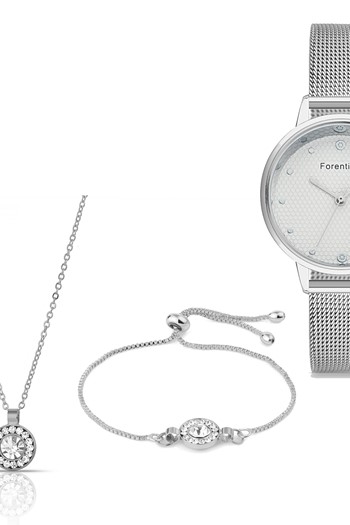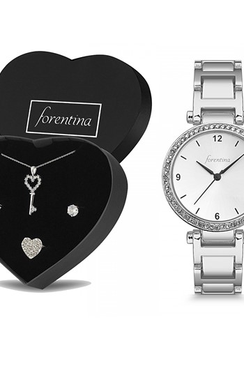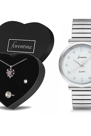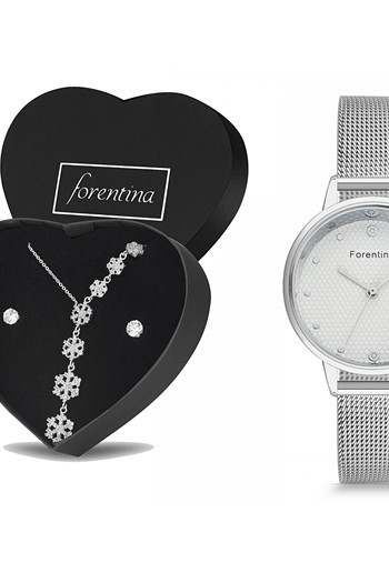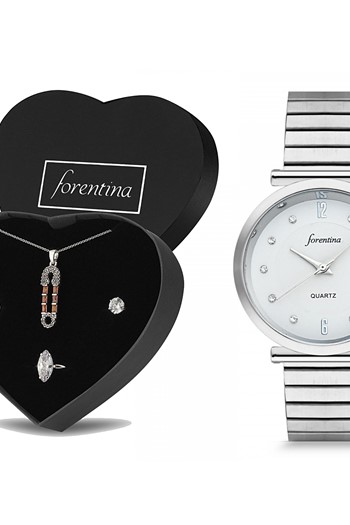 Forentina Bayan Gri Metal Kol Saati Kalpli Takı Seti Kombin PS2475