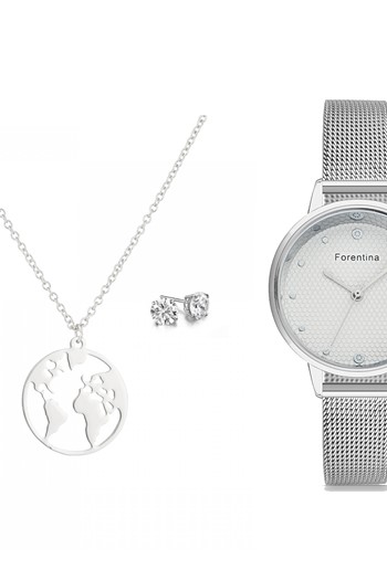 Forentina Bayan Gri Metal Kol Saati Tektaş Kolye Kombin Set PS2472