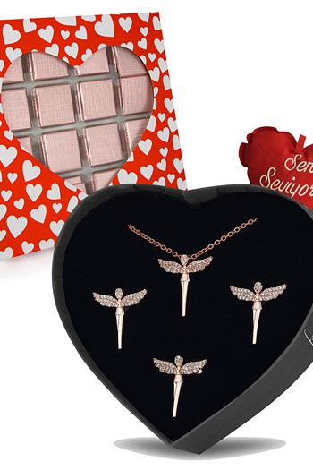 Forentina Rose Melek Kolye Küpe Yüzük - Kalpli Yastık Çikolata Set PS2482