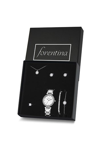 Forentina Gümüş Renk Tektaş Kolye Küpe Bileklik Saat Hediye Set PS2797