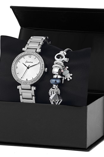 Forentina Kadın Gri Metal Kol Saati Yuvarlak Tasarım Takı Seti PS2842