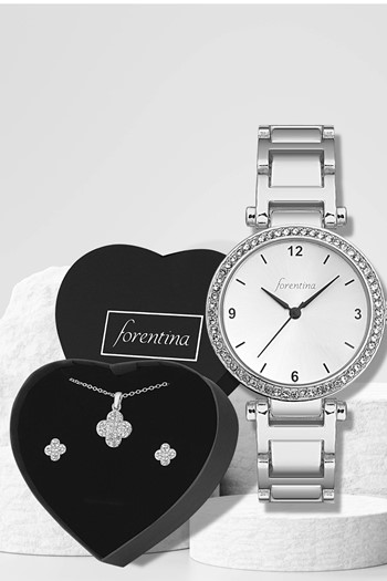 Forentina Kadın Gri Metal Kol Saati - Yonca Kolye Küpe Set PS2843