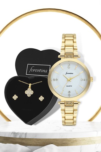 Forentina Kadın Sarı Metal Kol Saati - Yonca Kolye Yonca Küpe Set PS2844