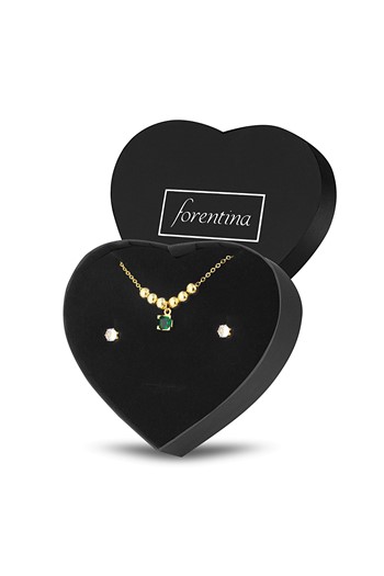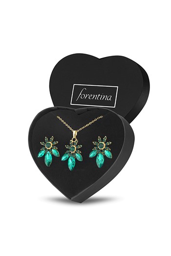 Forentina Altın Kaplama Yeşil Taşlı Kolye Küpe Takı Seti PS3120