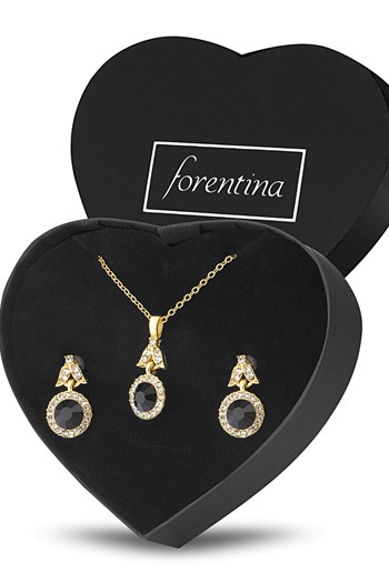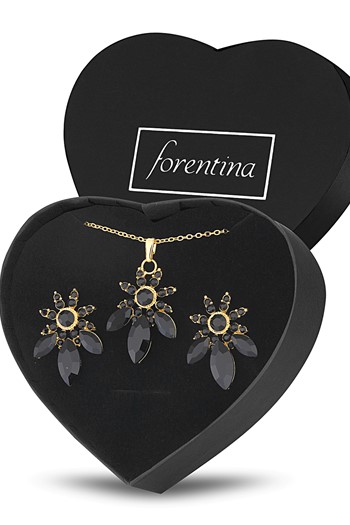 Forentina Altın Kaplama Siyah Taşlı Kolye Küpe Takı Seti PS3100