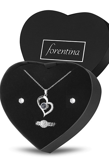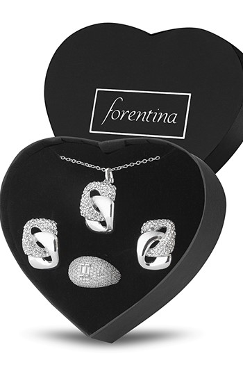 Forentina Gümüş Kaplama Kalpli Kolye Küpe Yüzük Takı Seti PS3110
