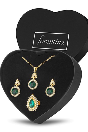 Forentina Altın Kaplama Yeşil Taşlı Kolye Küpe Yüzük Takı Seti PS3114