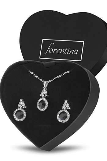 Forentina Gümüş Kaplama Siyah Taşlı Kolye Küpe Takı Seti PS3117