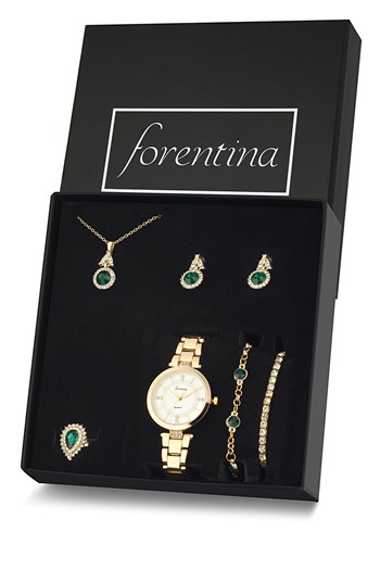 Forentina Altın Kaplama Yeşil Taşlı Kolye Küpe Bileklik Yüzük Saat Hediye Set PS3145