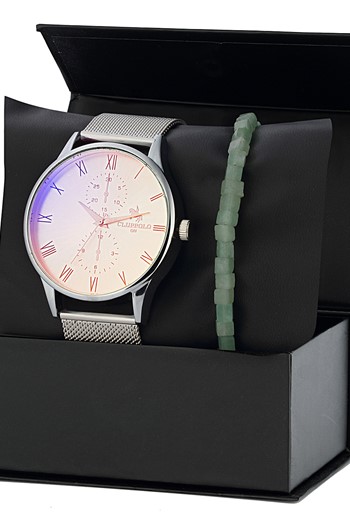 Forentina Erkek Metal Kol Saati Örgü Model Bileklik Kombin Set PS3147