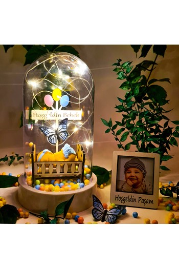 Kişiye Özel İsimli Yeni Doğan Hediyesi Hoşgeldin Erkek Bebek Led Işıklı Fanus