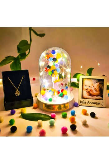 Kişiye Özel İsimli ve Fotoğraflı Çerçeve & Canım Annem Işıklı Ters Fanus & Kar Taneli Kolye Anneye Hediye